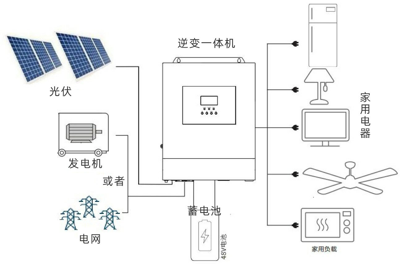 1、光伏组件:将光能转换成直流电能,通过一体机给电池充电,或直接逆变成交流电给负载供电。